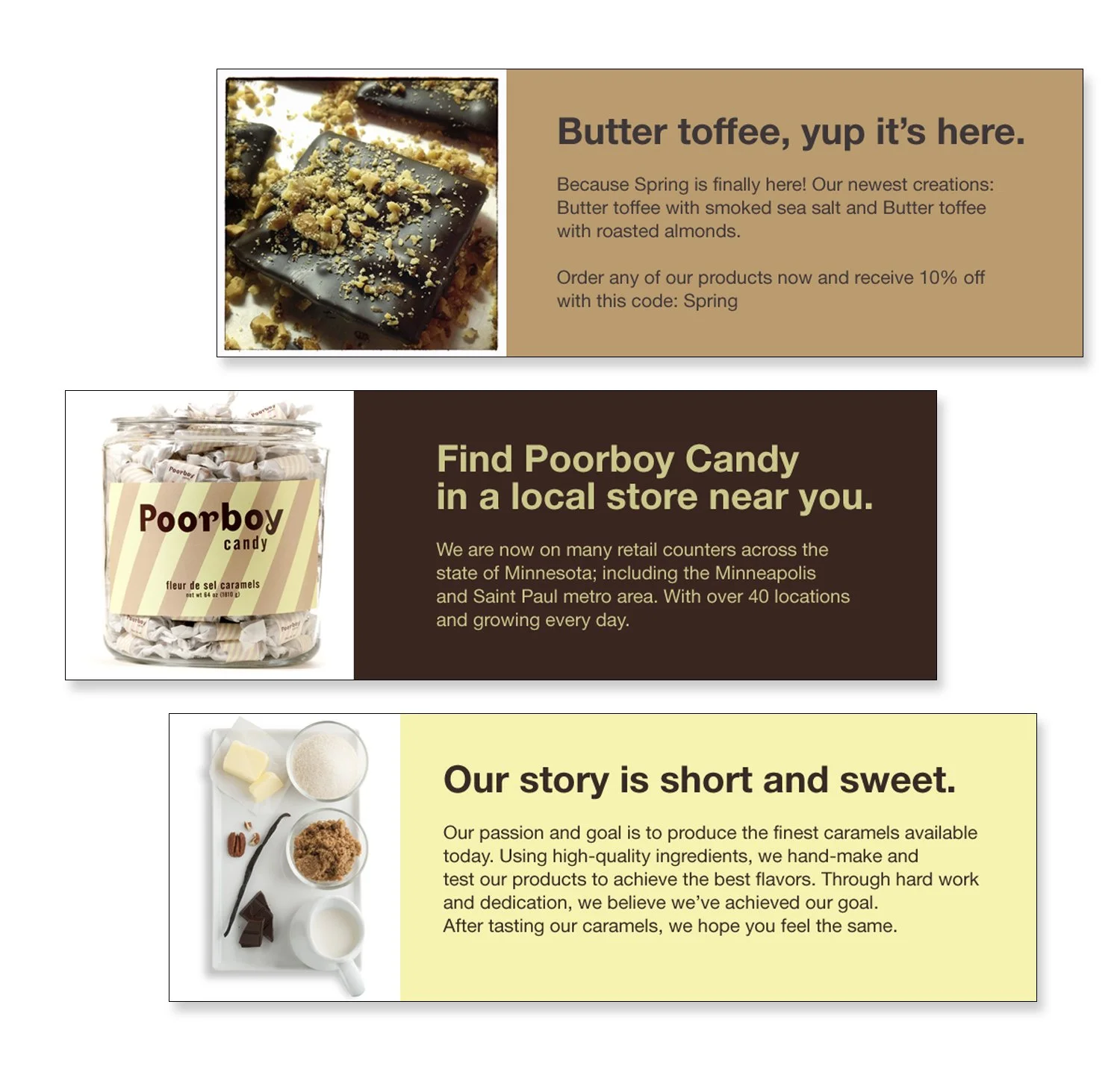 An artisan candy company specializing in caramels, caramel sauce and a variety of other traditional sweets. The color palette of the logo and identity system works well with the natural colors of the product. The strong stripe background gives a nostalgic feel. I developed all creative needs for the company, including art direction for photography. I designed the logo, color system, packaging, promo buttons, website, web banners, email images and trade show banners.