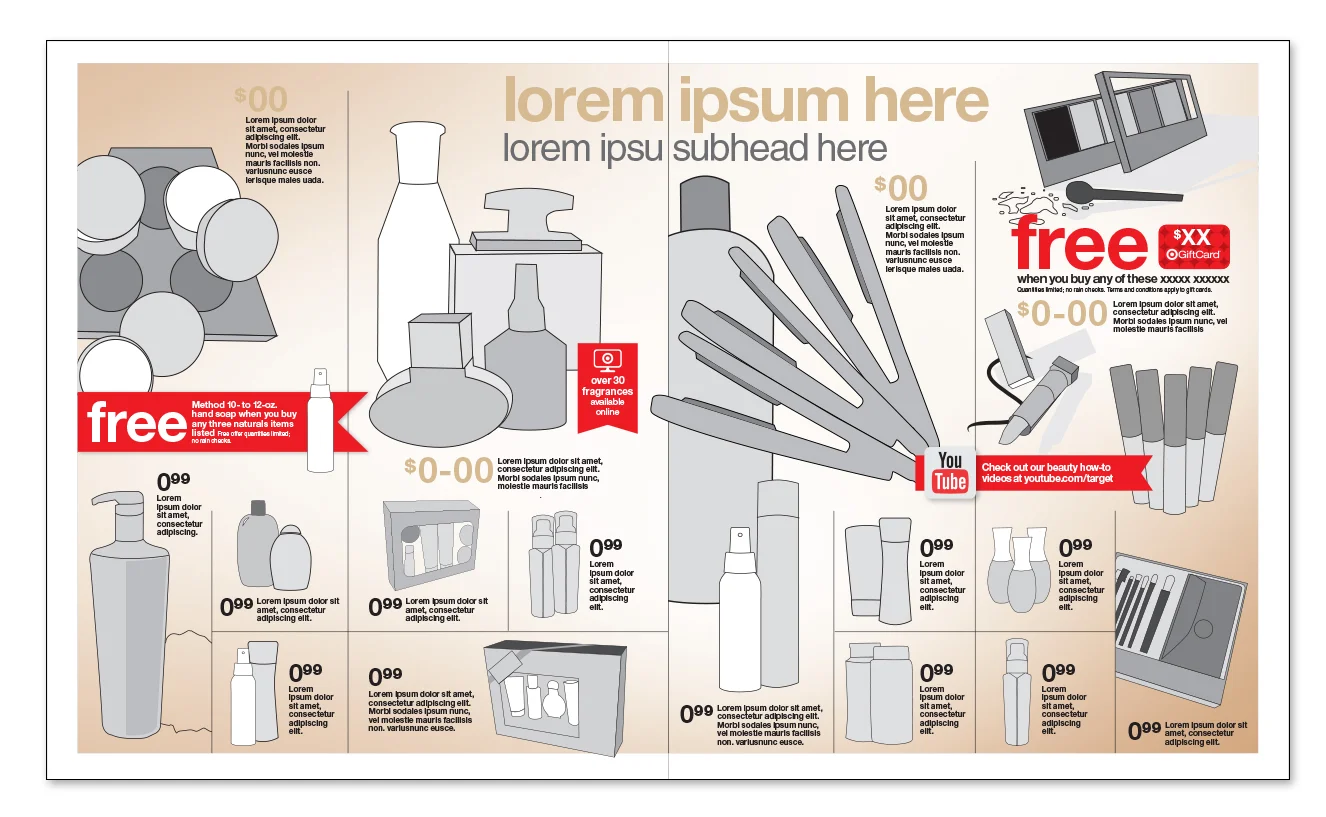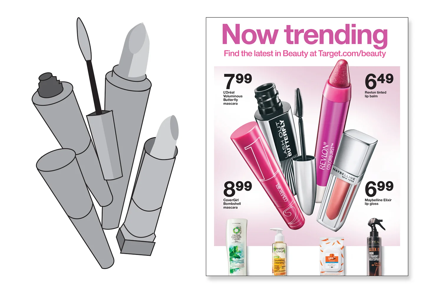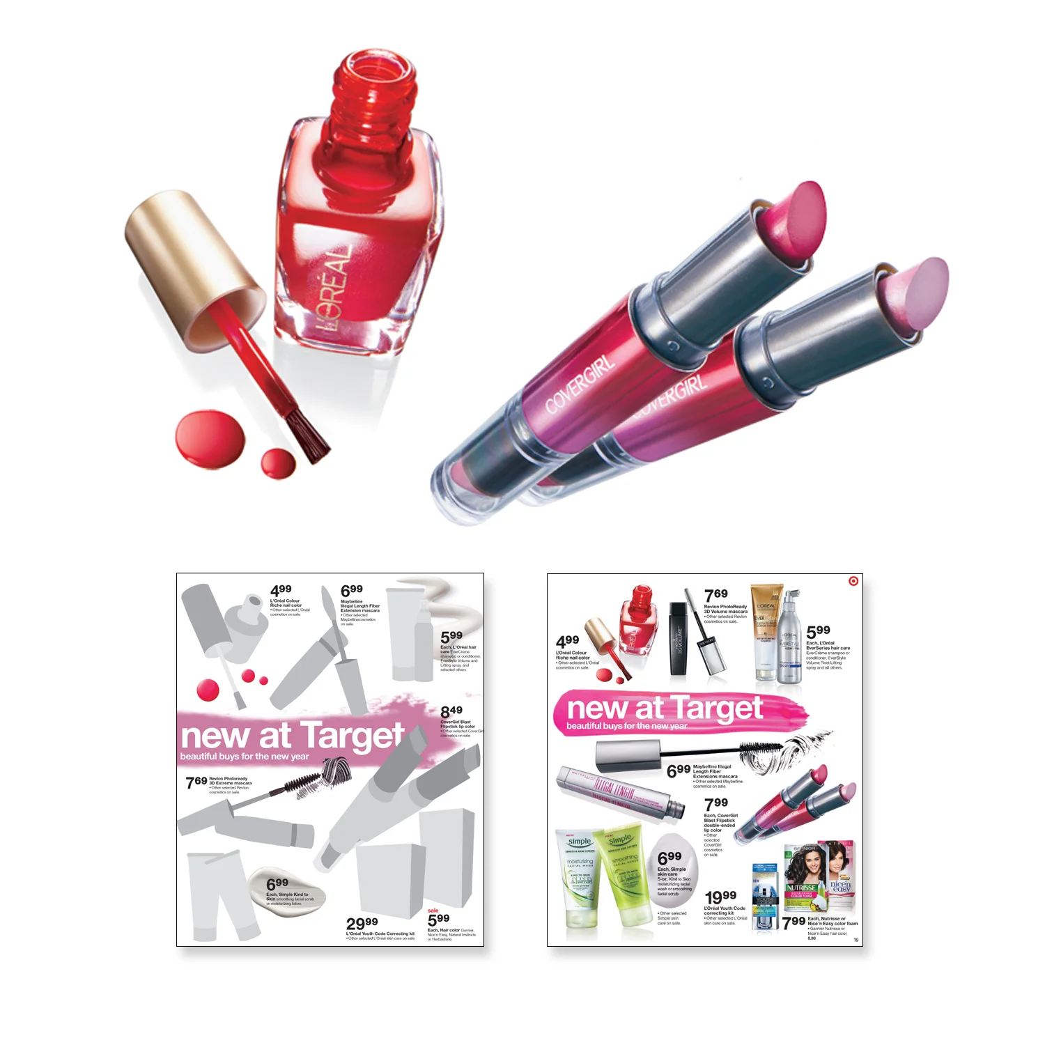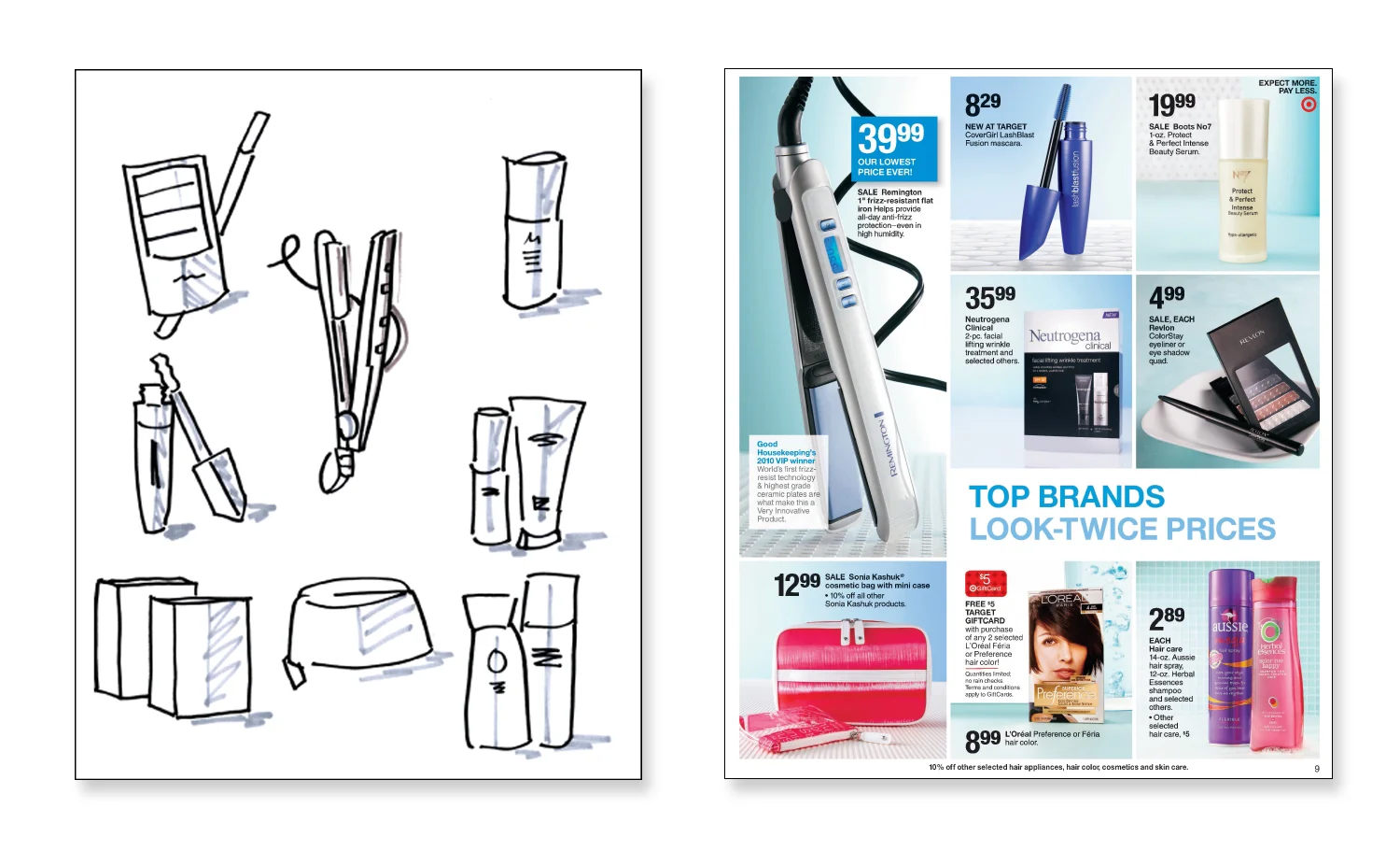 Some of my favorite work I do at Target is in the beauty world. Typically, I will sketch out a page to have a clear point of view on the layout and then use that same sketch for photography direction.